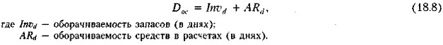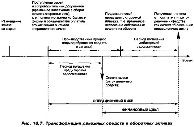 Управление денежными средствами и их эквивалентами Расчет операционного и финансового цикловВ числе важнейших характеристик эффективности текущей деятельности — показатели продолжительности операционного и финансового циклов. Операционный цикл (Operating Cycle) — это условное название периода — типового повторяющегося элемента производственно-коммерческого процесса (от получения сырья до возврата денежных средств в виде выручки), в течение которого денежные средства омертвлены в запасах и расчетах (дебиторах). Аналитический показатель, характеризующий среднее время омертвления денежных средств в этих активах, носит название продолжительности операционного цикла (Operating Cycle Period). Начало операционного цикла — появление материальных запасов на балансе фирмы как сигнал о начале трансформационной цепочки «сырье (с появлением обязательства оплатить его) ⇒ продукция ⇒ расчеты ⇒ денежные средства», а его окончание — появление на балансе выручки от реализации произведенной и проданной продукции. Подчеркнем: операционный цикл начинается с момента появления обязательства оплатить приобретенные производственные запасы, т. е. с момента формального (но не обязательно фактического) вложения денежных средств в запасы, и заканчивается моментом возврата денежных средств на счета фирмы в виде выручки (рис. 18.7). Алгоритм расчета имеет вид