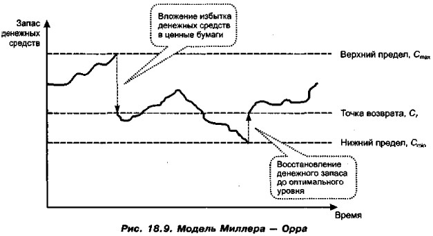 Определение оптимального уровня денежных средств Модель Миллере - ОрреМодель Баумоля проста и приемлема для предприятий, денежные расходы которых стабильны и прогнозируемы. В действительности такое случается редко; остаток средств на расчетном счете изменяется случайным образом, причем возможны значительные колебания. Модель, разработанная М. Миллером и Д. Орром, представляет собой компромисс между простотой и повседневной реальностью. Она помогает ответить на вопрос, как предприятию следует управлять своим денежным запасом, если невоз- ( можно с точностью предсказать каждодневный отток или приток денежных средств. Миллер и Орр использовали при построении модели процесс Бернулли — стохастический процесс, в котором поступление и расходование денег от периода к периоду являются независимыми случайными событиями. Логика действий финансового менеджера по управлению остатком средств на расчетном счете представлена на рис. 18.9. Остаток средств на счете хаотически меняется до тех пор, пока не достигает верхнего предела. Как только это происходит, предприятие начинает скупать высоколиквидные ценные бумаги с целью вернуть запас денежных средств к некоторому уровню (точке возврата).