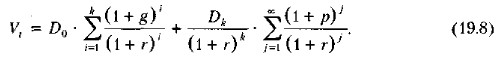 Оценка долевых ценных бумаг Оценка акции с изменяющимся темпом прироста дивидендаАкцией с неравномерно возрастающим дивидендом (Nonconstant Growth Stock) называется акция, в отношении которой нельзя сделать предположение о постоянстве роста дивидендов. Это самый общий случай; здесь оценку Vt можно делать лишь так называемым прямым счетом, а удобных универсальных формул нет. Тем не менее рассмотрим две ситуации, которые считаются более или менее реалистичными. Разбиение горизонта прогнозирования на несколько фаз постоянного роста. Заметим прежде всего следующее; из формулы (19,7) видно, что текущая цена обыкновенной акции очень чувствительна к параметру g. Даже незначительное его изменение может существенно повлиять на цену. Задание постоянного g на перспективу может представляться искусственным. Можно предусмотреть, что период прогнозирования поддается условному разбиению на несколько фаз, каждой из которых соответствует свой темп прироста дивиденда. Для примера рассмотрим ситуацию, когда обособлено две фазы; в течение первых k периодов темн прироста равен g, а в последующие периоды — р (р ≠ g). В этом случае формула (19.1) принимает следующий вид: