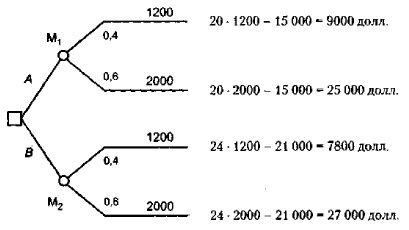 Методы теории принятия решений Метод построения дерева решенийВ более сложных ситуациях в анализе используют так называемый метод построения дерева решений. В основе метода — дерево решений (Decision Tree) как графическое представление системы принятия решений в условиях риска, когда задаются состояния природы, их вероятности появления и возможные варианты действий с сопутствующими доходами и (или) потерями. Последовательно перебирая возможные комбинации состояний природы и вариантов действий, находят оптимальное решение. Логику этого метода рассмотрим на примере. Пример Управляющему надо принять решение о целесообразности приобретения либо станка Mt, либо станка М2. Станок М2 более экономичен, что обеспечивает больший доход на единицу продукции, вместе с тем он более дорогой и требует относительно больших накладных расходов (в долл.).
