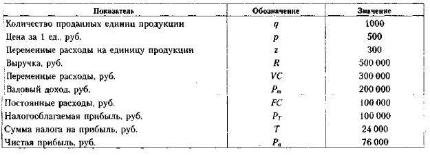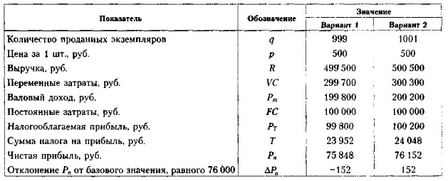 Подставляя в (5,14) исходные данные, можно найти, на сколько изменится прибыль при изменении количества реализованных экземпляров на единицу. (500 - 300)(1 - 0,76) = 152 руб. Таким образом, каждая единица реализованной продукции делает вклад в прибыль в сумме 152 руб. (при условии превышения критического объема продаж)2. Можно убедиться в правильности данного вывода, выполнив прямой расчет но исходным данным, когда объем реализованной продукции отклоняется на единицу от базового варианта, равного 1000 ед. (см. таблицу). 2Понятие критического объема продаж будет рассмотрено в разд. 14.2.