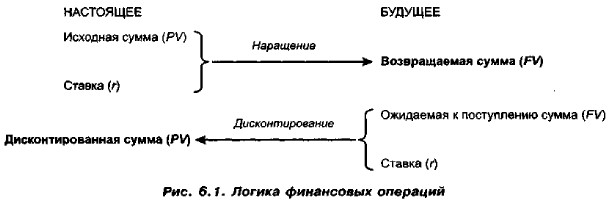 Глава 6. Логикa и технике финансовых вычислений 6.2. Операции наращения и дисконтирования (продолжение)Следует обратить внимание читателя на следующее весьма важное обстоятельство. В формулах (6.1) и (6.2) пока не акцентируется внимание на продолжительности периода, однако из алгоритма расчета с очевидностью следует, что обе ставки являются функцией времени: чем длительнее период, тем существеннее должно быть различие между суммовыми величинами PV и FV, а потому с изменением продолжительности временного интервала, т. е. продолжительности финансовой операции, должна меняться и ставка. Поскольку финансовые операции могут длиться от нескольких дней до нескольких лет, необходимо всегда помнить следующее правило: процентная ставка в финансовой операции должна быть некоторым образом увязана с продолжительностью операции. Обычно это делается путем задания некоторого базисного интервала, к которому привязывается ставка (год, квартал, месяц, день). Чаще всего характеристика финансовой операции делается с помощью годовой процентной ставки. Процесс, в котором заданы исходная сумма и ставка (процентная или учетная), в финансовых вычислениях называется наращением, искомая величина — наращенной суммой, а используемая в операции ставка — ставкой наращения. Процесс, в котором заданы ожидаемая в будущем к получению (возвращаемая) сумма и ставка, называется дисконтированием, искомая величина — дисконтированной суммой (иногда используется термин приведенная сумма), а используемая в операции ставка — ставкой дисконтирования. В первом случае речь идет о движении денежного потока от настоящего к будущему, во втором — о движении от будущего к настоящему (рис. 6.1).