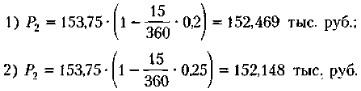 Скорость наращения стоимости векселя, т. е, наклон прямой {РРТ, FV}, зависит от уровня процентной ставки г, согласованной между векселедателем и векселедержателем. По мере приближения срока погашения векселя его теоретическая стоимость постоянно возрастает на сумму причитающихся за истекший период процентов; таким образом, в момент учета векселя она составит величину Р1, которую можно рассчитать по формуле (6.7). Таким образом, учитывая вексель в банке, его владелец теоретически мог бы рассчитывать на сумму P1, а факт ее получения означал бы, что с момента учета векселя кредитором векселедателя фактически становится банк. Вряд ли такое положение устраивает менеджеров банка, поскольку не очевидно, что заложенная в векселе доходность в размере ставки r будет привлекательна для банка. Именно поэтому предлагаемая банком сумма P2, которая рассчитывается по формуле (6.8), исходя из стоимости векселя к погашению и предлагаемой банком дисконтной ставки d, в принципе не связанной со ставкой r, в подавляющем большинстве случаев меньше теоретической стоимости векселя. Разность Пример Предприятие продало товар на условиях потребительского кредита с оформлением простою векселя: номинальная стоимость 150 тыс. руб., срок векселя — 60 дней, ставка процента за предоставленный кредит — 15% годовых. Через -15 дней с момента оформления векселя предприятие решило учесть вексель в банке; предложенная банком дисконтная ставка составляет: (1) 20%; (2) 25% годовых. Рассчитать суммы, получаемые предприятием и банком, если используются обыкновенные проценты с точным числом дней. Решение Будущая стоимость векселя FV к моменту его погашения, рассчитанная по формуле (6,7), составит