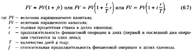 Для понимания сути краткосрочной операции наращения капитала, вероятно, наиболее наглядно последнее представление в (6.7), из которого видно, что получаемое по итогам операции наращение рассчитывается умножением исходного капитала Р на произведение дневной ставки Определяя продолжительность финансовой операции, принято день выдачи и день погашения кредита считать за один день. В зависимости от того, чему берется равной продолжительность года (квартала, месяца), размер промежуточной процентной ставки может быть различным. Возможны два варианта: