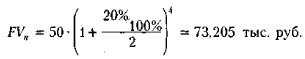 Вновь обращаем внимание читателя на то обстоятельство, что в формулах наращения и дисконтирования должно соблюдаться соответствие между процентной ставкой и продолжительностью базисного периода. Так, переход от годового начисления процентов к квартальному (m = 4) предполагает переход к квартальной ставке, что как раз и имеет место в формуле (6.10). Пример Вложены деньги в банк в сумме 50 тыс. руб. на 2 года с полугодовым начислением процентов, под 20% годовых. В этом случае начисление процентов проводится 4 раза по ставке 10%