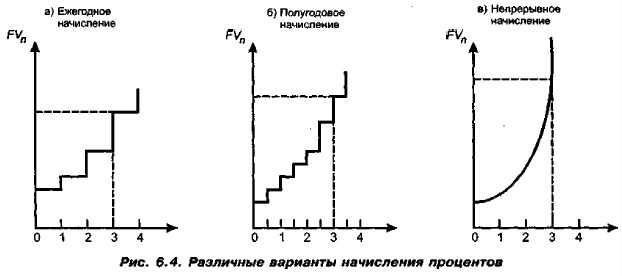 Процентные ставки и методы их начисления Непрерывное начисление процентовИзменение накапливаемой суммы в зависимости от частоты начисления показано на рис. 6.4. Сравнительная характеристика и интерпретация приведенных графиков очевидны, вместе с тем эти графики позволяют наглядно представить влияние частоты начисления процентов. При дискретном наращении каждая ступенька характеризует прирост основной суммы в результате очередного начисления, причем величина ступеньки все время возрастает. В рамках одного года одной ступеньке на левом графике соответствуют две ступеньки на среднем графике меньшего размера, однако в сумме они превышают эту ступеньку однократного начисления, Таким образом, ордината точки, соответствующей концу трехлетнего периода, на среднем графике будет выше, чем на левом. Еще более быстрым темпом идет наращение при непрерывном начислении, что и показывает график справа.