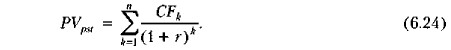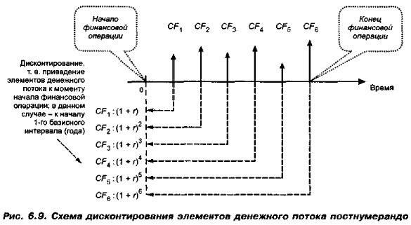 Финансовая операция подразделяется на п базисных периодов, к концу каждого из которых привязан очередной платеж CFk (на рис. 6.9 это 6 периодов). Расчет дисконтированной стоимости данного потока сводится к приведению каждого его элемента к началу финансовой операции, т. е. в точку 0, т. е. к делению на множитель (1 + r) в соответствующей степени. Элемент CF1 отдален от точки приведения на один интервал, потому он делится на (1 + r); элемент CF2 отдален двумя интервалами, а потому делится на (1 + r)2, и т. д. После приведения всех элементов потока в точку 0 их можно просуммировать. Таким образом, общая формула для исчисления дисконтированной стоимости потока постнумерандо имеет следующий вид: