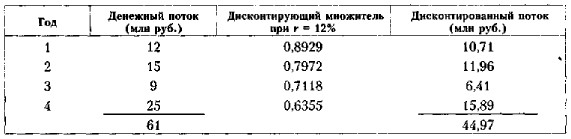 Как видим, чем дальше от начала финансовой операции отстоит элемент денежного потока, тем более осторожна его оценка. Все элементы дисконтированного потока уже приведены в точку 0, а потому их можно просуммировать, а полученную сумму 44,97 млн руб. можно сравнивать, например, с запрашиваемой суммой инвестиции.