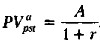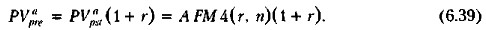 Оценка аннуитетов Оценка срочного аннуитетаЭкономический смысл FM4(r, n), называемого дисконтирующим множителем для аннуитета, заключается в следующем. Он показывает, чему равна, с позиции текущего момента (т. е. момента, на который осуществляется дисконтирование), суммарная величина срочного аннуитета в одну денежную единицу (например, один рубль), продолжающихся п равных базисных периодов с заданной процентной ставкой г. Множитель FM4 (r, n) часто используется в финансовых вычислениях, и поскольку его значения в общем виде зависят лишь от r и n, они табулированы. Благодаря этому существенно упрощаются расчеты (см. Приложение 3). При одном денежном поступлении Дисконтирующий множитель FM4 (r, n) полезно интерпретировать как величину капитала, поместив который в банк под сложную процентную ставку r, можно обеспечить регулярные выплаты в размере одной денежной единицы в течение n периодов (выплаты проводятся в конце каждого периода). Дисконтированная стоимость аннуитета пренумерандо (Present Value of Annuity Due) (т. e. денежного потока пренумерандо с равными элементами) представляет собой сумму дисконтированных элементов потока, исчисляемую в предположении, что: (а) все элементы одинаковы, (б) каждый элемент потока начинается в начале соответствующего базисного интервала и (в) дисконтирование осуществляется по схеме сложных процентов с использованием заданной процентной ставки r. Для демонстрации логики расчета можно воспользоваться графиком на рис. 6.11 в предположении, что CFk = А = const, а горизонт планирования равен п. Вновь вспомним о том, что значения дисконтированной стоимости потоков пренумерандо и постнумерандо отличаются на множитель (1 + r), т. е. дисконтированная стоимость денежного потока пренумерандо рассчитывается по формуле