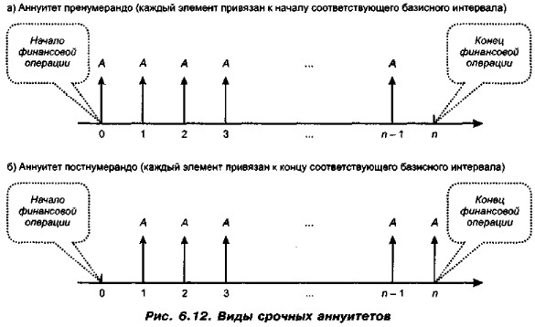 Оценка аннуитетов 6.7.1. Оценка срочного аннуитетаОценка аннуитетовОдним из ключевых понятий в финансовых и коммерческих расчетах является понятие аннуитета. Логика, заложенная в схему аннуитетных платежей, широко используется при оценке долговых и долевых ценных бумаг, в анализе инвестиционных проектов, а также в анализе аренды. Оценка срочного аннуитетаАннуитет (иногда в литературе используются термины «рента», «финансовая рента») представляет собой частный случай денежного потока. Известны два подхода к его определению. Согласно первому подходу аннуитет представляет собой однонаправленный денежный поток, элементы которого имеют место через равные временные интервалы. Второй подход накладывает дополнительное ограничение: элементы денежного потока одинаковы по величине, В дальнейшем изложении материала мы будем придерживаться именно второго подхода. Любой элемент денежного потока называется членом аннуитета (членом ренты), а величина постоянного временного интервала между двумя его последовательными элементами называется периодом аннуитета (периодом ренты). Если каждый элемент аннуитета имеет место в конце соответствующего периода, аннуитет называется аннуитетом постнумерандо (Ordinary Annuity); если в начале периода — аннуитетом пренумерандо (Annuity Due), Аннуитет, все элементы которого равны между собой, называется постоянным; если равенства нет, аннуитет носит название переменного. Пример аннуитета пренумерандо: накопление денег на банковском счете, когда вклады делаются, например, в начале каждого месяца. Пример аннуитета постнумерандо: регулярное получение процентов по ценной бумаге (по вкладу) по итогам очередного месяца. Если число равных временных интервалов ограничено, аннуитет называется срочным; в противном случае аннуитет носит название бессрочного. Для срочного аннуитета; CF1 = CF2 = ... = CFn = А. Графическое представление срочного аннуитета пост- и пренумерандо приведено на рис. 6.12. Вновь обращаем внимание читателя на то, что в обоих случаях финансовая операция, описываемая аннуитетом, начинается в точке 0 и заканчивается в точке п (грубо говоря, делая графические построения и проводя расчеты, всегда надо помнить о нехитром правиле; число стрелок и количество базисных интервалов должно совпадать). Примером срочного аннуитета постнумерандо могут служить регулярно поступающие рентные платежи за пользование сданным в аренду земельным участком в случае, если договором предусматривается регулярная оплата аренды по истечении очередного периода. В качестве срочного аннуитета пренумерандо выступает, например, схема периодических денежных вкладов на банковский счет в начале каждого месяца с целью накопления суммы для крупной покупки. Исторически вначале рассматривались ежегодные денежные поступления (базисный период принимался равным одному году), что и послужило основой для поименования потока аннуитетом («год» на латинском языке — anno). В дальнейшем в качестве периода стал выступать любой промежуток времени при сохранении прежнего названия.