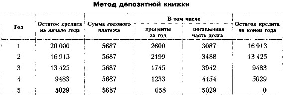 Для лучшего понимания логики метода депозитной книжки целесообразно рассуждать с позиции кредитора. Для банка данный контракт представляет собой инвестицию в размере 20 000 долл., т. е. отток денежных средств, что и показано на схеме. В дальнейшем в течение 5 лет банк будет ежегодно получать в конце года сумму А, причем каждый годовой платеж будет включать проценты за истекший год и часть основной суммы долга. Так, поскольку в течение первого года заемщик пользовался кредитом в размере 20 000 долл., то платеж, который будет сделан в конце этого года, состоит из двух частей: процентов за год в сумме 2600 долл. (13% от 20 000 долл.) и погашаемой части долга в сумме {А - 2600) долл. В следующем году расчет будет повторен при условии, что размер кредита, которым пользуется заемщик, составит уже меньшую сумму по сравнению с первым годом, а именно (20000 — А + 2600) долл. Отсюда видно, что с течением времени сумма уплачиваемых процентов снижается, а доля платежа в счет погашения долга возрастает. Из схемы на рис. 6.13 видно, что мы имеем дело с аннуитетом постнумерандо, о котором известна его текущая стоимость, процентная ставка и продолжительность действия. Поэтому для нахождения величины годового платежа А можно воспользоваться формулой (6.35):