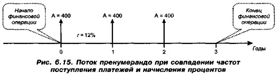 Первая ситуация наиболее прозрачна. Например, если речь идет об аннуитете, удается оценить поток с помощью несложных процедур с привлечением факторных и дисконтирующих множителей. Вторая и третья ситуации уже менее очевидны и требуют некоторых усилий. Технику вычислений в упомянутых ситуациях рассмотрим на примерах; при этом предполагается, что финансовые операции осуществляются опытными участниками рынка, действующими исходя из очевидного требования максимизации возможного дохода (минимизации возможных затрат). В частности, выражением данной предпосылки является применение, как правило, схемы сложных процентов. Пример Периодически в течение 3 лет в банк делается вклад по схеме пренумерандо в сумме 400 тыс. руб. Какая сумма будет на счете к концу операции, если предлагаемая банком процентная ставка наращения равна 12% годовых? Рассмотреть три ситуации: (1) поступления ежегодные (единовременная сумма 400 тыс. руб, в год вносится на счет в начале каждого года), начисление процентов ежегодное; (2) поступления ежеквартальные (по 100 тыс. руб. в квартал в течение 3 лет), начисление процентов ежегодное; (3) поступления ежегодные (единовременная сумма 400 тыс. руб. в год), начисление процентов ежеквартальное. Решение Прежде чем читатель познакомится с результатами расчетов, предлагаем ему попытаться спрогнозировать ожидаемые результаты на качественном уровне, т. е. ответить на вопрос: в какой из ситуаций по окончании операции на счете будет накоплена большая (меньшая) сумма и почему? Ситуация 1 Это типовой вариант финансовой операции со следующими характеристиками: денежный поток представляет собой аннуитет пренумерандо с величиной аннуитетного платежа 400 тыс. руб.; число элементов потока равно трем; базовый интервал — год; ставка наращения — 12% (см. рис. 6.15).