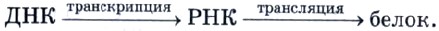 Второе отличие ДНК от РНК вы также без труда назовете сами: в качестве углевода пентозы нуклеотид ДНК содержит дезоксирибозу, а РНК — рибозу. Кроме разного строения нуклеотидов, ДНК и РНК отличаются также и вторичной структурой. За исследования в определении этой структуры два американских биохимика Дж. Уотсон и Ф. Крик были удостоены Нобелевской премии. РНК представляет собой одинарную цепь полимера, а ДНК — двойную. Двойная спираль ДНК построена в строгом соответствии с принципом комплементарности: против аденинового нуклеотида одной цепи всегда располагается тиминовый другой полимерной цепи, против гуанинового — всегда цитозиновый. Этот порядок обусловлен возникновением водородных связей между комплементарными (дополняющими друг друга) нуклеотидами (рис. 79). Еще одно отличие ДНК от РНК состоит в их локализации в частях клетки. Так, ДНК находится преимущественно в хромосомах клеточного ядра (99% всей ДНК клетки), а также митохондриях и хлоропластах. РНК же входит в состав ядрышек, рибосом, митохондрий, пластид и цитоплазмы. Нуклеиновые кислоты различаются также числом нуклеотидов: от 80 нуклеотидов в молекулах транспортных РНК до нескольких десятков тысяч в ДНК. ДНК — главная молекула в живом организме. Она хранит генетическую информацию, которая передается от одного поколения к другому. В молекулах ДНК в закодированном виде записан состав всех белков организма. Каждой аминокислоте, входящей в состав белка, соответствует свой код в ДНК — определенная последовательность из трех азотистых оснований (кодон). ДНК содержит всю генетическую информацию, но непосредственно в синтезе белка не участвует. Роль посредника между ДНК и местом синтеза белка выполняет иРНК. Процесс синтеза белка на основе генетической информации схематично можно разбить на две основные стадии: считывание информации (транскрипция) и синтез белка (трансляция):