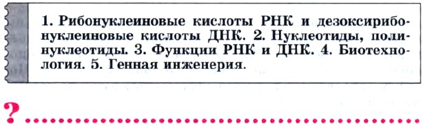 1. Какие соединения называют нуклеиновыми кислотами? Какие типы нуклеиновых кислот вы знаете? 2. Как устроен нуклеотид? Сравните строение нуклеотидов ДНК и РНК. 3. Сравните строение, локализацию в клетках и функции РНК и ДНК. 4. Какие разновидности РНК вы знаете? Какую роль играет каждый вид РНК в биосинтезе белка? 5. Приведите доказательства единства организации всего живого на Земле, начиная с рассмотрения химического состава клеток до высших биополимеров — нуклеиновых кислот. 6. Дана последовательность нуклеотидов на участке одной из полимерных цепей ДНК: А—Ц—Г—Г—Т—А—А—Ц—Г—Т. Определите последовательность нуклеотидов на комплементарном участке второй цепи. 7. Что такое биотехнология? Приготовьте сообщение о возникновении и развитии этого направления в современной науке. 8. Что такое генная инженерия? Приготовьте сообщение об успехах современной генной инженерии. 9. Что такое трансгенные формы организмов? Как вы считаете, безопасно ли использование в пищу трансгенных или генетически модифицированных продуктов? Умеете ли вы различать трансгенную пищевую продукцию по информации на упаковках? 10. Выдающимся достижением науки последних лет считается расшифровка генома человека. Что вы знаете об этом? Приготовьте сообщение на эту тему.