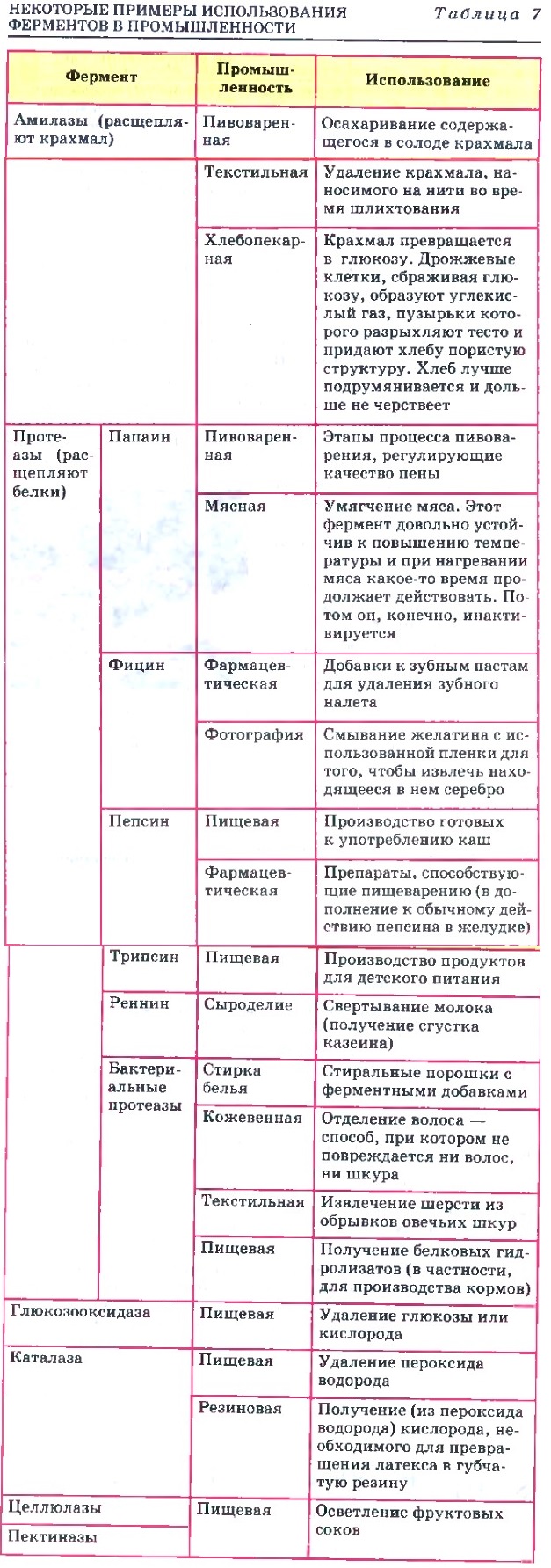 Кислотность или основность среды физиологических жидкостей определяет биологическую активность клеток организма, которая, в свою очередь, зависит от «работы» действующих в них ферментов (табл. 6). Каждая из физиологических жидкостей имеет определенное значение pH, и отклонение от нормы может быть причиной тяжелых заболеваний. Ферменты играют важную роль и в проведении многих технологических процессов. Их используют, например, в процессах приготовления пищи, в производстве пищевых продуктов и напитков (рис. 81), фармацевтических препаратов, моющих средств, текстиля, кожи и бумаги (табл. 7).