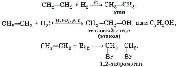 Этилен — это бесцветный газ без запаха, почти нерастворим в воде. Он обладает способностью ускорять созревание плодов и овощей, что используют в овощехранилищах, куда закладывают недозрелую плодоовощную продукцию. Рассмотрим химические свойства алкенов на примере этилена. Наличие в молекулах алкенов двойной С=С-связи обусловливает их химические свойства. Для алкенов, как для непредельных углеводородов, характерны реакции присоединения: 1) водорода (гидрирование), 2) воды (гидратация), 3) галогенов (галогенирование) и др. При этом одна из двух связей между атомами углерода разрывается, и оба атома присоединяют атомы или группу атомов реагента. В результате алкен превращается в алкан или его производное: