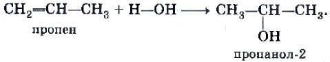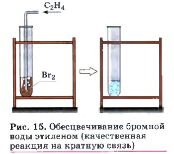 При этом происходит обесцвечивание бромной воды (раствора брома в воде) (рис. 15). Аналогичная реакция с хлором имеет практическое значение, поскольку приводит к образованию важного продукта — 1,2-дихлорэтана, используемого в качестве растворителя и для получения пластмасс. Для гомологов этилена, например пропилена, реакция гидратации протекает в соответствии с правилом В. В. Марковникова. При присоединении полярных молекул, например галогеноводородов или воды, к алкену водород преимущественно присоединяется к атому углерода при двойной связи, с которым соединено большее число атомов водорода: