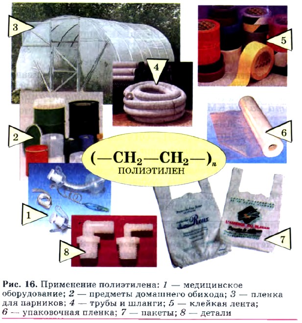 Полимеризацию проводят в присутствии инициаторов, например перекисных соединений, которые являются источниками свободных радикалов. Перекисными соединениями называют вещества, молекулы которых включают группу —О—О—. Простейшим перекисным соединением является пероксид водорода Н-О-О-Н. Вещество, вступающее в реакцию полимеризации, называют мономером, продукт такой реакции — полимером, формулу в скобках в уравнении такой реакции — структурным звеном, а индекс n — степенью полимеризации, которая показывает, сколько структурных звеньев образуют молекулу полимера. В настоящее время нашу жизнь невозможно представить без полимеров. Изделия из них все в большей степени вытесняют из нашего быта изделия, изготовленные из природных материалов, поскольку полимеры обладают самыми разнообразными свойствами, сравнительно дешевы, легко обрабатываются. Полиэтилен представляет собой важнейшую пластмассу, которая находит широкое применение в народном хозяйстве (рис. 16).