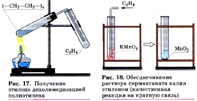 В лабораторных условиях с помощью реакции деполимеризации технического полиэтилена (она является обратной процессу полимеризации), например, из полиэтиленовых гранул, можно получить этилен (рис. 17):