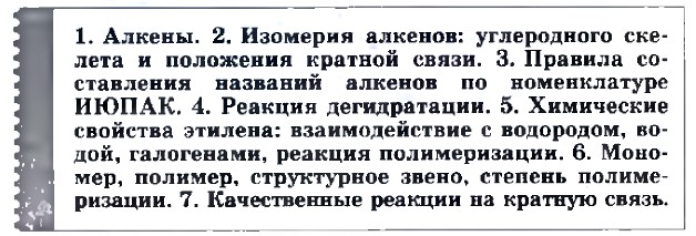 1. Какие вещества называют алкенами? 2. Дайте характеристику гомологического ряда алкенов согласно плану: а) общая формула; б) родовой суффикс; в) виды изомерии; г) номенклатура; д) характерные реакции. 3. Как получают этилен: а) в промышленности; б) в лаборатории? 4. По аналогии с этиленом запишите уравнения реакций получения пропена: а) промышленного (из пропана); б) лабораторного (из пропанола-1 СН3—СН2—СН2—ОН). 5. Найдите химические термины-антонимы в названиях реакций, характерующих химические свойства и способы получения этилена. Дайте их определения. 6. Какими способами можно отличить этилен от этана? 7. Найдите массовую долю углерода в молекулах: а) пропана; б) пропилена (пропена). 8. Найдите объем этилена (н. у.), полученного реакцией дегидратации 230 мл 95%-го этилового спирта (плотность 0,8 г/мл). 9. Этилен горит светящим пламенем в отличие от бесцветного пламени этана. Почему? Ответ подтвердите расчетом массовой доли углерода в молекулах этих веществ. Составьте уравнение реакции горения этилена.
