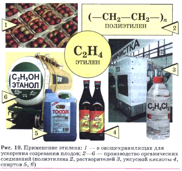 Этилен — важнейший продукт химической промышленности, так как используется для получения других ценных веществ и материалов (рис. 19).