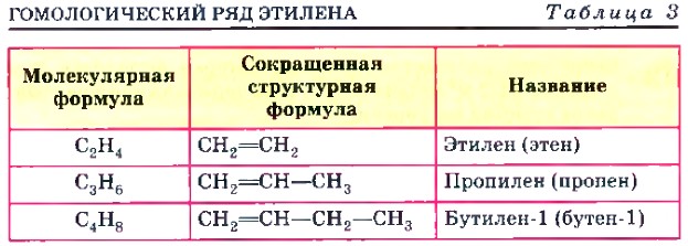 Этилен — родоначальник гомологического ряда алкенов (табл. 3). Строение молекулы этилена представлено на рисунке 14. Нетрудно заметить, что молекула этилена имеет плоскостное строение. Аналогично и у всех алкенов по месту расположения двойной связи фрагмент молекулы будет иметь плоскостное строение. Начиная с третьего члена гомологического ряда алкенов, содержащего в молекуле четыре атома углерода, появляется изомерия углеродного скелета и изомерия положения кратной связи: