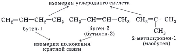 Для алкенов характерна межклассовая изомерия с углеводородами другого класса, имеющего такую же общую формулу СnН2n, — циклоалканами. Особенностью химического строения циклоалканов является наличие замкнутой цепочки атомов углерода — цикла, например: