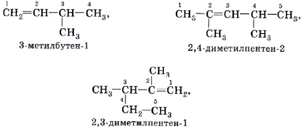 Особенности построения названий алкенов состоят в том, что главная цепь атомов углерода должна обязательно включать двойную С=С-связь, и ее нумерацию проводят с того конца главной цепи, к которому эта связь ближе. В названии углеводорода, оканчивающегося на -ен, цифрой указывают номер того атома углерода, от которого начинается двойная углерод-углеродная связь. Остальные правила формирования названий алкенов остаются такими же, как и для алканов. Например:
