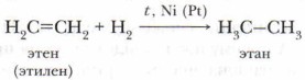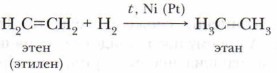 Для алкенов характерны реакции присоединения, при которых ν-связь легко разрывается и к атомам углерода присоединяются другие атомы или группы атомов. Расширим свои знания о свойствах этиленовых углеводородов. 1. Реакции присоединенияА .Гидрирование (гидрогенизация) В присутствии катализатора (Ni, Pt) и при нагревании этиленовые углеводороды взаимодействуют с водородом с образованием предельных углеводородов (алканов):