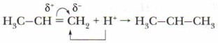 Положительно заряженный ион водорода (протон) — электрофильная частица атакует молекулу алкена, при этом ν-связь поляризуется быстрее σ-связи и разрывается. Электрофил присоединяется к звену СН2, так как здесь скапливается бо́льший отрицательный заряд и образуется органический ион — карбокатион: