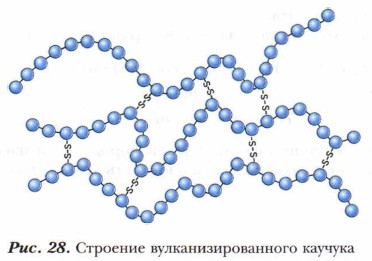 При изучении свойств каучука выяснилось, что при нагревании с серой он становится более прочным. Атомы серы вступают в химическое взаимодействие с линейными молекулами каучука и как бы «сшивают» их по месту двойных связей в крупные сетчатые трёхмерные структуры. Получается резина (рис. 28). Этот процесс получил название вулканизации. В результате вулканизации липкий и непрочный каучук превращается в упругую эластичную резину, которая сохраняет свойства эластичности при значительных колебаниях температуры. Резина более устойчива к действию кислорода воздуха, чем каучук.
