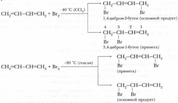 Наибольшее значение из различных представителей диеновых углеводородов имеют 1,3-бутадиен и 2-метил-1,3-бутадиен (изопрен), т. е. алкадиены с сопряженными двойными связями: Физические свойства. 1,3-Бутадиен при обычных условиях — газ, легко сжижается при температуре -5 °С. 2-метил-1,3-бутадиен — легкокипящая летучая жидкость, температура кипения +34,1 °С. Задание. Учитывая, что алкадиены имеют две двойные связи, предположите, какие реакции будут характерны для них. Химические свойства. Сопряжённые алкадиены как типичные представители непредельных углеводородов вступают в реакции присоединения. А. Галогенирование Присоединение диенами галогенов протекает с образованием смеси продуктов присоединения в 1,2- и 1,4-положениях. Соотношение продуктов зависит от конкретных условий, например температуры реакции и природы растворителя: