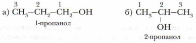 Изомерия и номенклатура спиртовСпиртам свойственно явление изомерии. Изомерия одноатомных спиртов обусловлена не только строением углеводородной цепи, но и положением функциональной группы —ОН. Пропанол, молекулярная формула которого C4H8O, имеет два изомера: