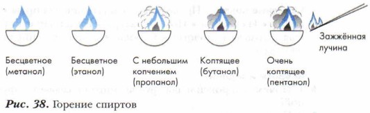 При рассмотрении химических свойств одноатомных спиртов мы сначала изучим свойства, присущие всем органическим соединениям, затем — характерные для класса предельных одноатомных спиртов, а после рассмотрим индивидуальные свойства некоторых его представителей. 1. Общее свойство практически всех органических соединений — реакция горения. Как и все органические соединения, спирты горючи. Горение спиртов — экзотермический окислительно-восстановительный процесс. Например: С2Н5ОН + 3O2 → 2СO2 + ЗН2O + 1366 кДж