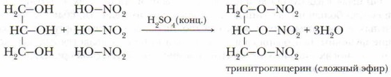 Нитроглицерин (тринитроглицерин) — тяжёлая маслянистая жидкость со сладковатым вкусом, нерастворимая в воде, но хорошо растворима в этиловом спирте, легко взрывается даже от небольшого сотрясения или нагревания, может взрываться и самопроизвольно (это его свойство используется для изготовления взрывчатых веществ). При взрыве происходит реакция: 4C3H5(ONO2)3 → 12СO2 + 10Н2О + 6N2 + O2 Он служит сырьём для получения полимера лавсана. Его широко используют в качестве растворителя. В больших количествах он идёт для приготовления антифризов. Наиболее употребим глицерин. Старейший способ его производства — гидролиз жиров и масел.