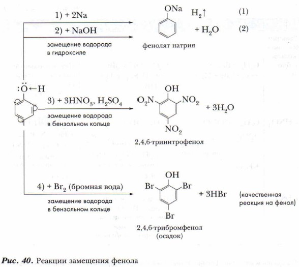 Глава 6. Спирты, фенолы Фенолы3. Вы наблюдали реакцию фенола с бромной водой. Признаком её было образование белого осадка трибромфенола, его формула С6Н2Вr3—ОН, которая доказана экспериментально (см. структурную формулу на с. 139). Три атома водорода в бензольном кольце замещаются на атомы брома. Задание. Запишите уравнение реакции брома с бензолом. Бензол с бромной водой не реагирует, а с бромом взаимодействует лишь при наличии катализатора (железные опилки), причём бром замещает в бензольном ядре только один атом водорода. Проблема. Реакция брома с фенолом протекает с большей лёгкостью, чем с бензолом, и при этом замещаются в бензольном кольце три атома водорода, а не один, как у бензола. Почему? Постарайтесь решить эту проблему самостоятельно!