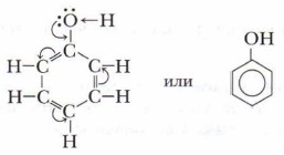 Гидроксильная группа в феноле непосредственно связана с атомом углерода радикала фенила и в отличие от спиртов проявляет донорные (кислотные) свойства. Фенил оказывает влияние на гидроксильную группу (поляризация связи О—Н), что повышает кислотные свойства фенола. В отличие от радикалов предельных углеводородов, являющихся донорами электронов, бензольное кольцо, точнее, радикал С6Н5—, называемый фенилом, обладает особенностью оттягивать к себе электроны, в данном случае — от атомов кислорода гидроксильной группы —ОН. Это приводит к поляризации, что делает атом водорода более подвижным, а вещество фенол приобретает слабые кислотные свойства. В свою очередь, гидроксильная группа оказывает влияние на радикал. Под влиянием функциональной группы —ОН в бензольном кольце фенола электронная плотность распределяется неравномерно: частичный отрицательный заряд сосредоточен у атомов углерода, находящихся в 2,4,6-положениях. Это облегчает реакции замещения атомов водорода бензольного кольца именно в указанных положениях. В результате реакций замещения получают 2,4,6-производные фенола.