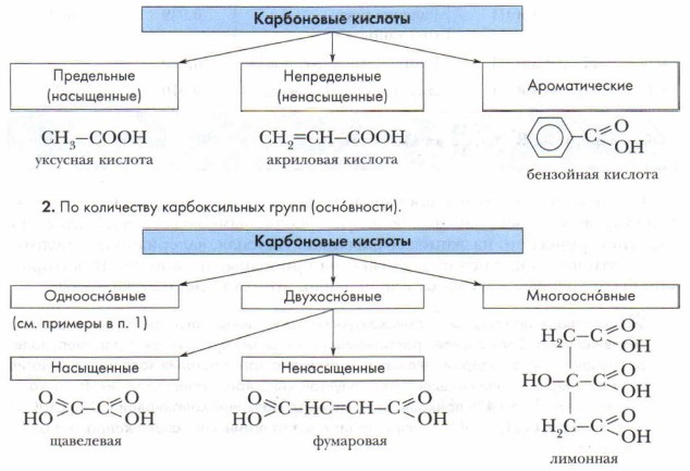 Невозможно и не нужно знать все карбоновые кислоты, но, чтобы не затеряться в их многообразии, обратимся к их классификации. Классификация карбоновых кислот строится по двум признакам: 1) по природе углеводородного радикала; 2) по количеству карбоксильных групп в молекуле кислоты (основности). Классификация карбоновых кислот1. По природе углеводородного радикала.
