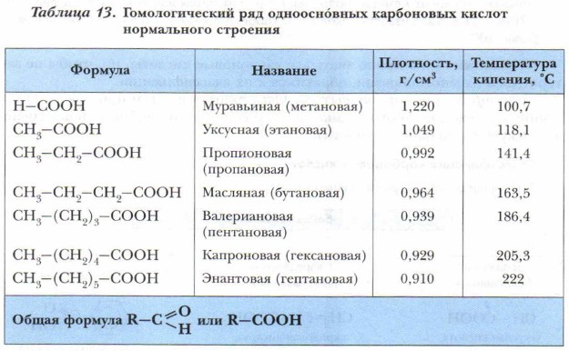 Задание. Проанализируйте содержание таблицы 13. Какие закономерности изменения физических свойств вы обнаружили? Сравните плотность и температуру кипения одноосновных карбоновых кислот и сделайте заключение о влиянии радикала на их физические свойства. Физические свойства карбоновых кислотВ целом в ряду гомологов с увеличением молекулярной массы уменьшается растворимость в воде и плотность, возрастает температура кипения. Первые три члена гомологического ряда — жидкости, имеющие резкий запах, начиная с масляной кислоты хорошо растворимые в воде — также жидкости, обладающие резким неприятным запахом, но плохо растворимые в воде. Высшие кислоты с числом атомов углерода 10 и более — твёрдые вещества, без запаха, нерастворимые в воде.