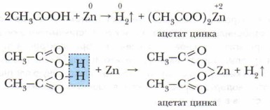 Благодаря наличию в воде иона Н+ они имеют кислый вкус, изменяют окраску индикаторов и проводят электрический ток. В водном растворе эти кислоты — слабые электролиты. С увеличением углеводородного радикала снижается степень диссоциации и сила кислот в разбавленных растворах. Карбоновые кислоты обладают химическими свойствами, характерными для растворов неорганических кислот, т. е. взаимодействуют с металлами, их оксидами, гидроксидами и слабыми солями. 2. Взаимодействие карбоновых кислот с металлами(Активными и среднеактивными) с образованием солей: