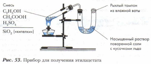 Задание. 1. Предложите возможные способы смещения равновесия данной реакции. 2. На рисунке 53 представлен прибор для получения сложного эфира. Объясните особенности его устройства на примере получения этилацетата, учитывая, что нагревание ведётся на очень слабом пламени, и в насыщенном растворе поваренной соли этилаце- тат не растворяется.