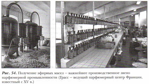 Распространение в природе сложных эфировСложные эфиры широко распространены в природе. Ароматы цветов, ягод, плодов и других частей растений обусловлены присутствием в них сложных эфиров. Последние являются ведущими составными частями эфирных масел. Эфирными маслами называют летучие вещества, которые можно выделить из определённого вида растений. Некоторые сложные эфиры в виде фруктовых и растительных эссенций используются для приготовления напитков, кондитерских изделий, парфюмерной продукции (рис. 54).