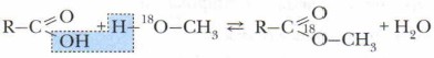 Учитывая особенности строения карбоксильной группы, следовало бы ожидать, что от молекулы кислоты будет отщепляться наиболее подвижный протон, а спирт, в свою очередь, будет предоставлять всю гидроксигруппу. Однако эксперимент убедительно показал, что это не так. Механизм этой реакции был изучен с помощью метода меченых атомов. В специально проведённых экспериментах использовался метанол, молекулы которого содержали изотоп кислорода 18О. Было обнаружено, что тяжёлый атом кислорода в результате реакции оказался не в молекулах воды, а вошёл в состав образующегося сложного эфира: