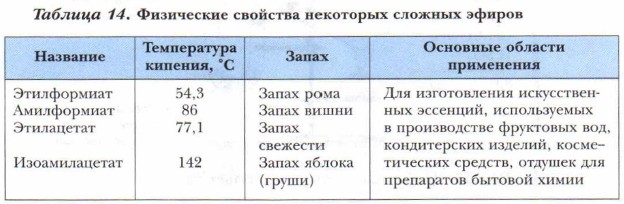 Сложные эфиры низших карбоновых кислот — летучие жидкости или твёрдые вещества, плохо растворяющиеся в воде, с приятным запахом, легче воды (например, плотность изоамилацетата — 0,876 г/см3) (табл. 14). Сложные эфиры высших спиртов и карбоновых кислот — твёрдые, воскоподобные вещества.