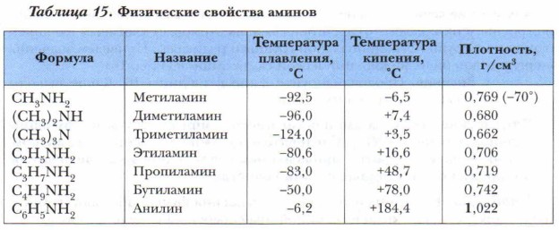 Рассмотрите шаростержневые модели молекул простейших первичных, вторичных и третичных алифатических аминов (рис. 56). Что общего в их строении? Физические свойства аминовЭти свойства определяются составом и строением аминов. Они являются производными аммиака, поэтому их физические свойства прежде всего обусловлены функциональной аминогруппой —NH2. Так, простейшие алифатические амины (метиламин, этиламин, диметиламин) — газообразные вещества, хорошо растворимы в воде, запах низших аминов напоминает запах аммиака. Средние амины — жидкости с низкой температурой кипения, с характерным «рыбным» запахом. Амины с большим числом атомов углерода, начиная с C12H25NH2, — твёрдые вещества, без запаха. Проблема. В чём причина хорошей растворимости этих аминов в воде? Итак, молекулы аминов, растворяясь в воде, образуют водородные связи. Амины растворимы и в органических полярных растворителях. Вы уже знаете, что физические свойства гомологов закономерно изменяются с увеличением их молекулярной массы. По мере роста углеродного скелета молекул аминов уменьшается их растворимость в воде. С ростом молекулярной массы увеличивается температура кипения и другие физические константы (табл. 15).