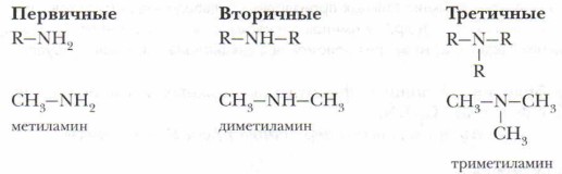 Примеры аминов: R—NH2, H2N—R—NH2, R—NH—R, R3N. Важнейшие представители аминовМетиламин CH3NH2 (первичный амин) и димегиламин Н3С—NH—СН3 (вторичный амин) — бесцветные газы, хорошо растворимые в воде, с резким запахом аммиака. Они используются в органическом синтезе для получения красителей, лекарств и других соединений. Функциональная группа первичных аминов —NH2 называется аминогруппой (некоторые смешанные амины содержат ещё и другие функциональные группы).