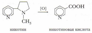 Но у атома азота молекулы пиридина есть ещё неподелённая пара электронов, которая не участвует в образовании ни σ-связей, ни π-электронной системы. По этой причине пиридин можно рассматривать как амин. Пиридин C5H5N представляет собой бесцветную жидкость с tкип =115 °С. хорошо растворимую в воде и органических растворителях, с характерным неприятным запахом. Он весьма ядовит, вдыхание его паров может привести к тяжёлому поражению нервной системы. Пиридин, как амин, также проявляет свойства оснований. Как и амины, пиридин, растворяясь в воде, окрашивает лакмус в синий цвет, присоединяет протон при реакциях с минеральными кислотами. Пиридин и его гомологи в значительных количествах содержатся в каменноугольной смоле, являющейся источником их промышленного получения. Производные пиридина (алкалоиды) широко распространены в природе, содержатся в организмах растений и животных. К пиридиновым алкалоидам относится и никотин. Никотин — весьма токсичный алкалоид, включающий связанные ядра пиридина и пирролидина. Он воздействует на вегетативную нервную систему; сужает кровеносные сосуды. Один из продуктов окисления никотина в жёстких условиях — никотиновая кислота (витамин РР):