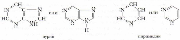 Пиримидин и пурин — ароматические кристаллические вещества, обладающие основными свойствами. Пиримидиновая и пуриновая группировки атомов входят в состав пиримидиновых и пуриновых оснований (цитозин, урацил, аденин, гуанин). В свою очередь, эти основания входят в состав природных высокомолекулярных соединений — нуклеиновых кислот, играющих важную роль в живых организмах (см. § 36).