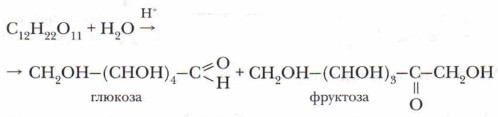 1. К раствору сахарозы прилейте несколько капель раствора серной кислоты и прокипятите; образовавшийся раствор разделите на две части. Если произойдёт гидролиз, в полученном растворе можно будет обнаружить два разных моносахарида. 2. К первой части раствора добавьте 3-4 капли раствора медного купороса и 2 мл щёлочи, подогрейте. Образуется красный осадок оксида меди(I). Этот опыт подтверждает наличие в растворе молекул с альдегидной группой, т. е. молекул глюкозы. 3. К другой части раствора прилейте несколько капель раствора резорцина1 и добавьте несколько капель концентрированной соляной кислоты, при нагревании до начала кипения появляется вишнёво-красное окрашивание, подтверждающее наличие в растворе фруктозы (это качественная реакция на фруктозу — реакция Селиванова). 1 Резорцин (1,3-диоксибензол) — бесцветное, кристаллическое вещество, применяется в производстве красителей, резорцино-формальдегидных смол; является антисептиком. Итак, при гидролизе сахарозы образуются два моносахарида — глюкоза и фруктоза: