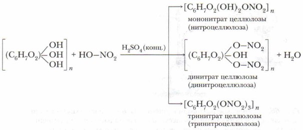 Нитраты целлюлозы образуются в результате воздействия на целлюлозу концентрированной азотной кислотой в присутствии концентрированной серной кислоты. В зависимости от условий проведения реакции этерификации в ней могут участвовать как одна, так и две либо три гидроксильные группы элементарных звеньев: